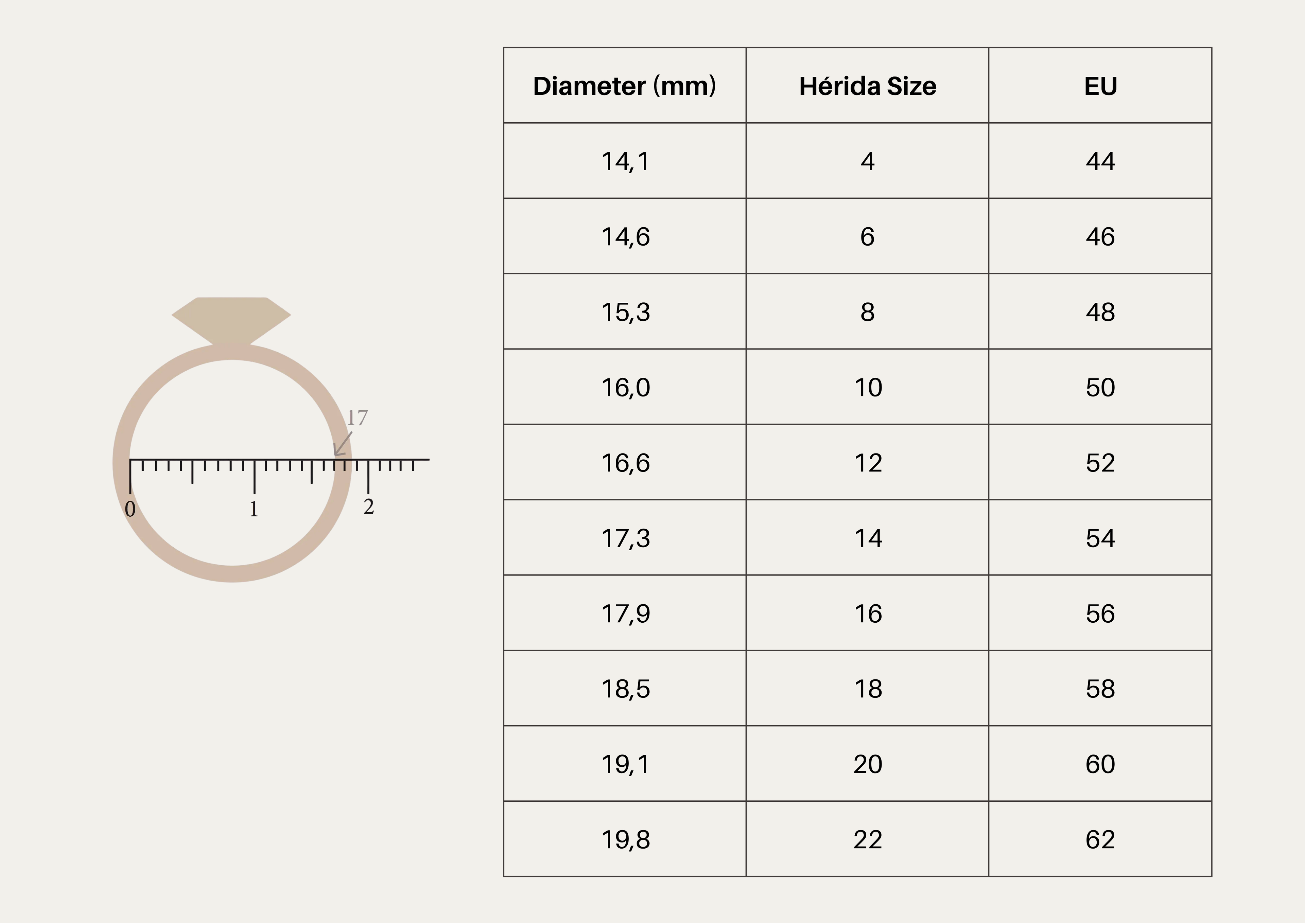 Wrap a tape measure around the finger you're going to wear the ring on. Measure without gaps, in millimetres. As there are several size standards, make sure you always use the European (EU) size chart to choose your ring correctly.Need help? Contact us using the form.